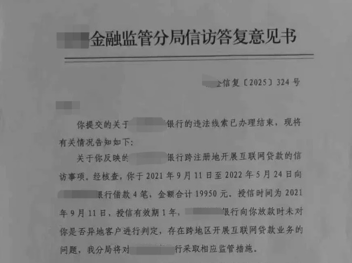 2025年10月,当地监管部门回复李先生称,经核查,该银行向李先生放款时未对其是否为异地客户进行判定,存在跨地区开展互联网贷款业务的问题,分局将对该银行采取相应监管措施。